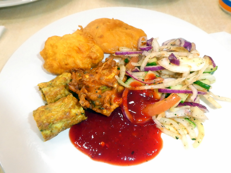 A simple Salad was presented, which I then realised was actually an elaborate plate of Spiced Onions. Red and White Onions had been infused with Mango Chutney, something different. Marg likes her Mango Chutney, this would go down well. The plate of Mixed Starters which followed was pitched well in terms of quantity.