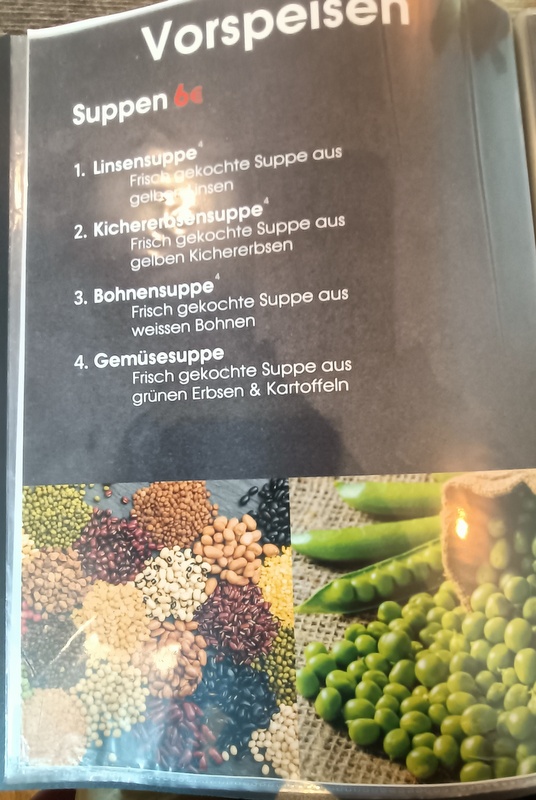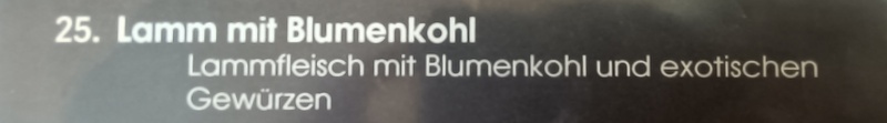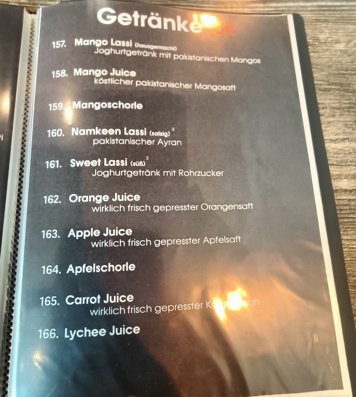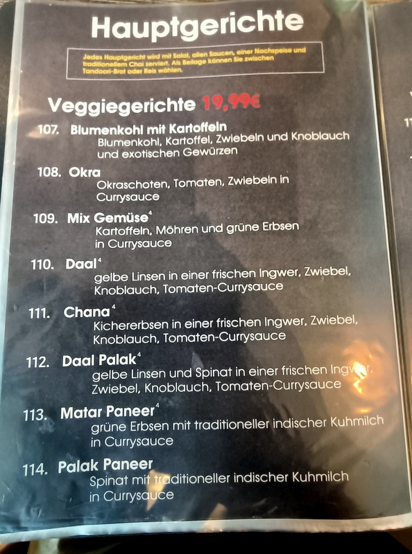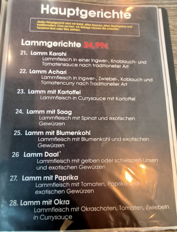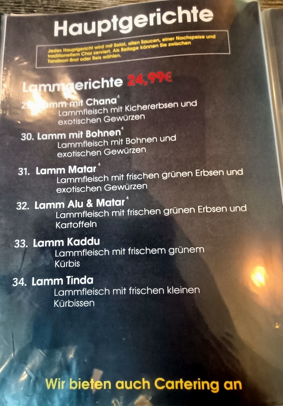 As the menu was sprinkled with Deutsch, some of the traditional Dishes were not recognised by Marg. She considered Lamm mit Paprika until I translated, no Capsicum! Aloo Gosht or Gobi Gosht? Marg chose the latter: Lamm mit Blumkohl.