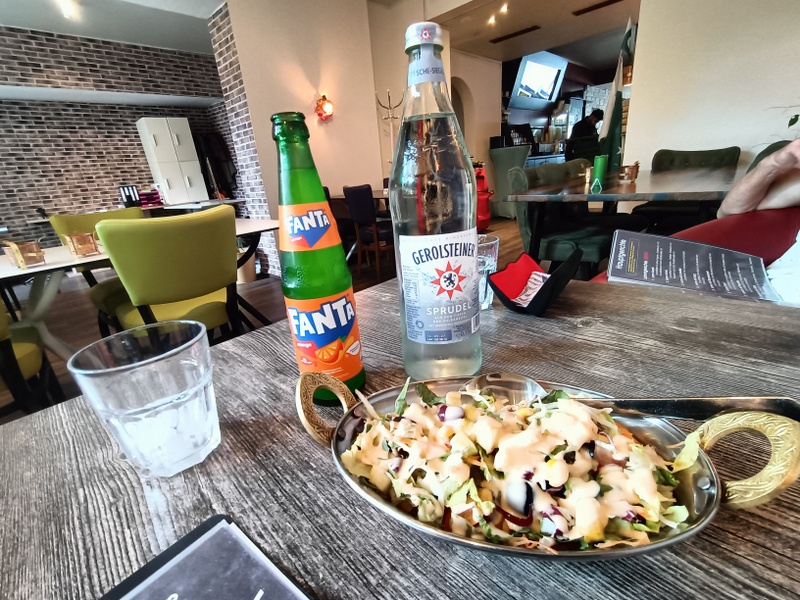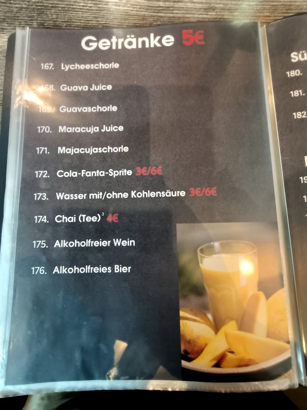 Drinks were sorted before we waded through the extensive menu. A bottle of Fanta (€3.00) and a 0.75l bottle of Sparkling Water (€6.00) were secured.