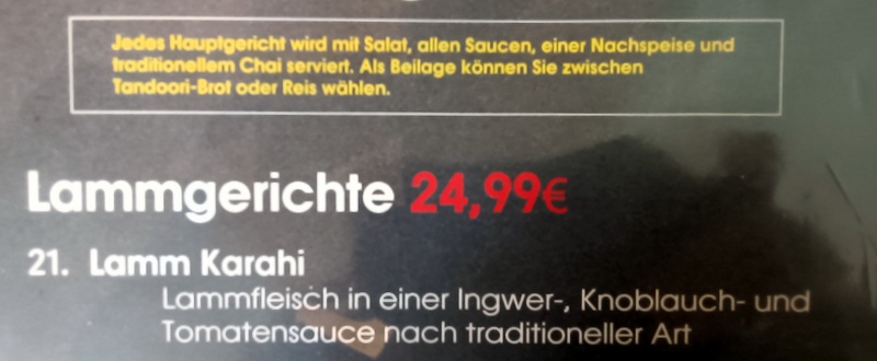 The extensive menu was recorded, having seen part of it online already, I knew that the Lamm Karahi is why I was here. The description of the ingredients: Ginger, Garlic, Tomato – is true to a Desi Masala. Not the Onion & Capsicum stir-fry abominations which the Mainstream restaurants across the land get away with. Fisch Karahi Masala (€26.99) may be one for the future. Fish Karahi, mmmm.