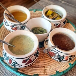 The Rice proved to be a portion of Pilau Matar. Hector having Rice with Karahi, the chaps back home would not serve me this. The Peas were of course, welcomed as another Interesting Vegetable. A tray of Dips was brought also, all home-made we were proudly told, the full array. Ahmed admitted that these were accompaniments for the Starters but was clearly keen to show them off. The menacing Green Chilli pulp sat in the centre: Achtung!