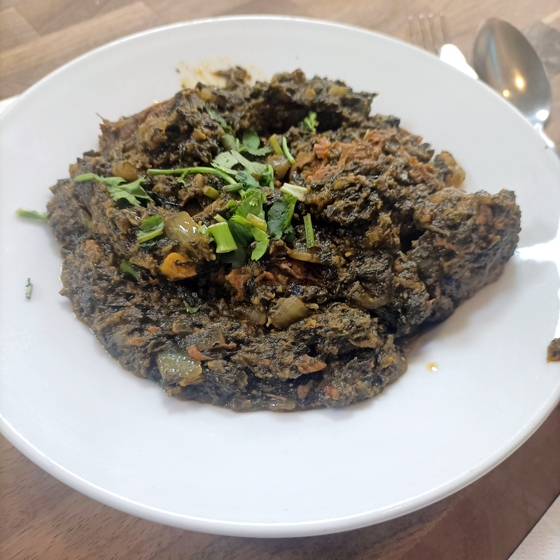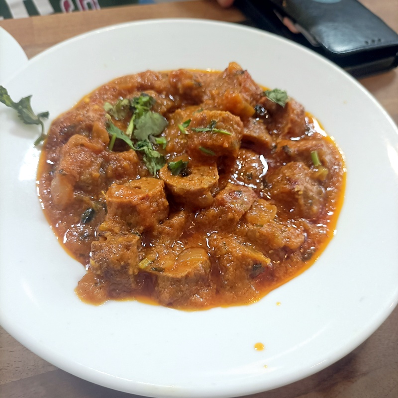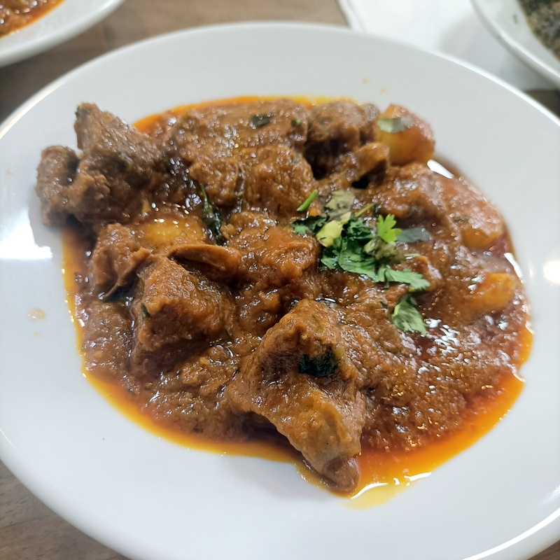 A basic curry with medium spice. A good blend of spices. Gemüse spinach, which I like because its quite thick. Tender meat, plenty of it. Just about finished it.