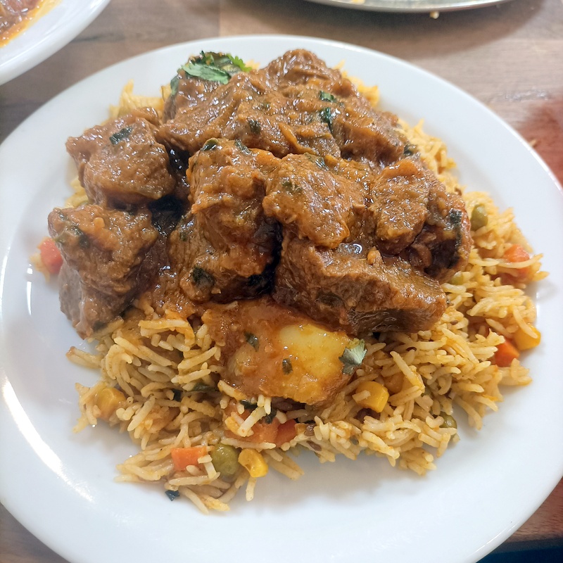 Technically, the wrong Masala, a traditional Aloo Gosht should be served in a Shorva, however the House Blended Masala is what I was expecting. That is how it is. I arranged ten large pieces of Lamb over the Rice, then half as many bits of Potato.