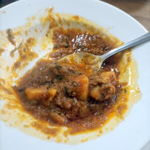 From somewhere, a slight Sweetness was manifesting itself, I’ll always nominate the Carrots when this is so. Otherwise, this was a worthy Curry, streets ahead of what is served in the Mainstream venues which prevail.