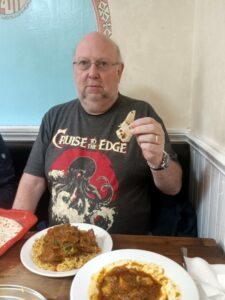 So, how had this been cooked? Seekh Kebab would normally be grilled, we saw little evidence for that. Meatballs could be baked then added to a Masala, or partly cooked therein. One of these, presumably. That Ricky was enjoying his Curry was made clear.