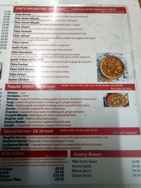 Start again. I drew his attention to the description for Tikka Chilli Korma (£9.99). A Korma with Chillies, it was as soon as I mentioned Desi Korma that Mein Host recognised me. The assistant, who was doing the actual cooking, became involved. He suggested Lamb Bhoona (£9.99), agreed. A Mushroom Rice (£4.00) would accompany.