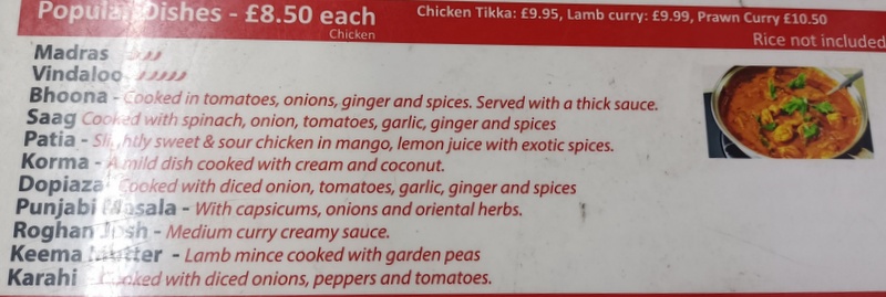 My first question was to confirm they would still cook me a Curry. Then it was a matter of what to order. Tikka Lamb I do not want in a Curry. I love Lamb Tikka, simply pouring a Masala over it does not make – Curry. This left Popular Dishes – Lamb (£9.99), though I did consider Aloo Gobi (£7.99), that would have avoided a lot of tension.