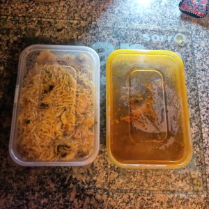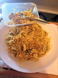 That the Rice portion tends to match the main course in a Takeaway, always amuses. Two could just about share one portion. I took what I thought I would manage, playing at home, leftovers are not a problem.