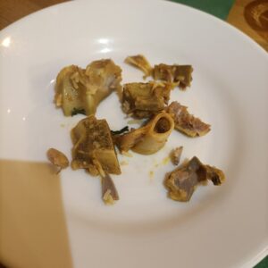 Decanting the Meat, the count reached double figures. Most pieces of Meat were on-the-bone, unlike Monday’s where the Bone count was remarkably low.