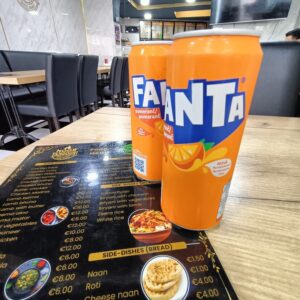 What I took to be Karahi Gosht proved to be otherwise. Lamb yes, but not Karahi. Jahanzaib pointed to another tray, this was Karahi. With Karahi comes Naan (€1.50). I was directed to the fridge for drinks, Fanta (€2.00) my preferred accompaniment whilst in België, I took two.