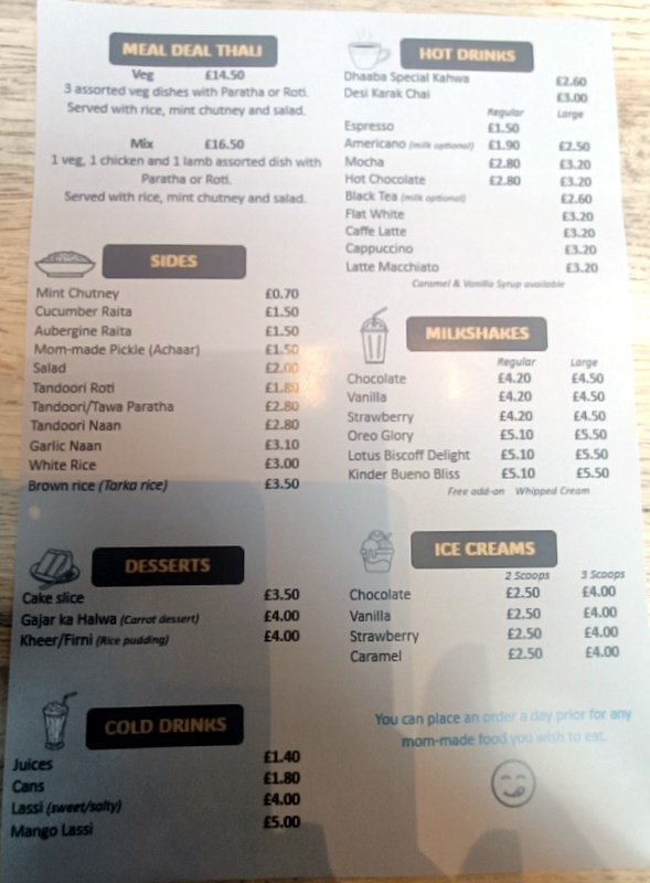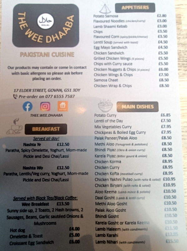 Almost a year since my last visit to The Wee Dhaaba (17 Elder Street, Govan, Glasgow G51 3DY), it is good to see that this family run, independent outlet is still in operation. With Marg not wishing Curry, the promise of Coffee & Cake was enough to entice her to this Coffee Shop come Curry House. Arriving at 13.30 on this damp autumn Monday lunchtime, there was no sign of cake on display. The counter area no longer features the cake cabinet. Cake no more?