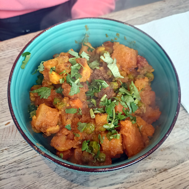 This makes its first appearance in Curry-Heute. Featuring Potato, Cauliflower, Carrot and Peas, in a dry, thick, minimal Masala, this matched the Hector idyll. Hot food – was remarked upon, a significant observation after two previous visits. Marg: