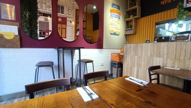 Taking my usual spot, all the tables were set out with cutlery. A high table and two stools have been installed on the opposite wall, thus emphasising that sitting in is to be encouraged in this otherwise Takeaway. Curry Pot now seats ten.