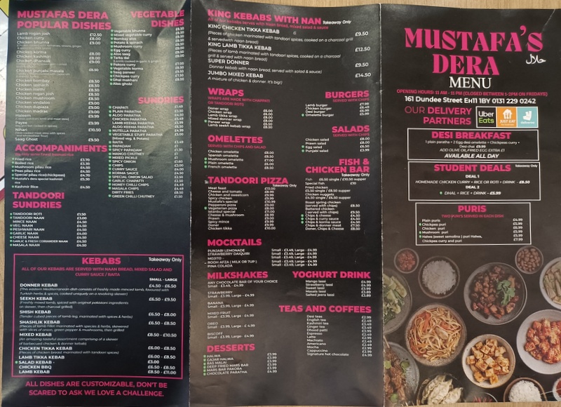 A well known and sometimes reliable map source has Mustafa’s Dera (161 Dundee Street, Edinburgh EH11 1BY) listed as a – Scottish restaurant, perhaps a bit of clarification is required. Opened in the last twelve months, to the best of my knowledge, Mustafa’s Dera displays itself as – Scottish Pakistani – this is what put it on Hector’s radar. Authentic Punjabi/Pakistani restaurants are few in Edinburgh compared to Glasgow, the former Curry Capital. However, the number appears to be growing.