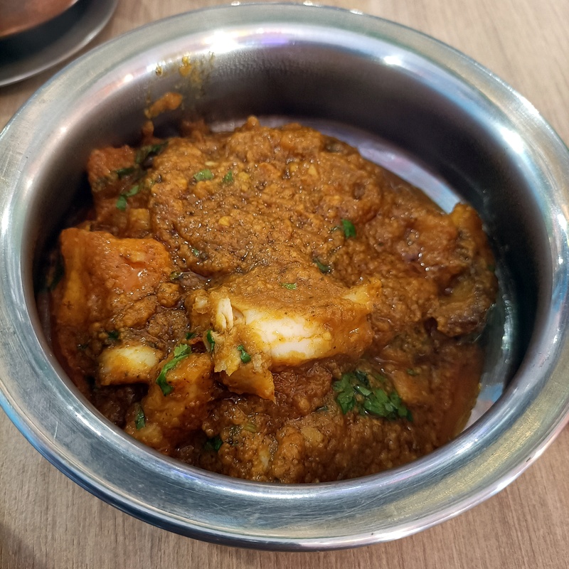 India meets Asia – is one description I found for this Curry. The Geographer wonders where that writer thought India might be. The Masala appeared to be identical to that served with the Fish Karahi. Usually a Soupçon crosses the table, not today. Once Marg had finished decanting, I licked her spoon. Oh, interesting, and markedly different from the Fish Karahi. Appearances can be deceptive. This Curry I shall have to try on a future visit.