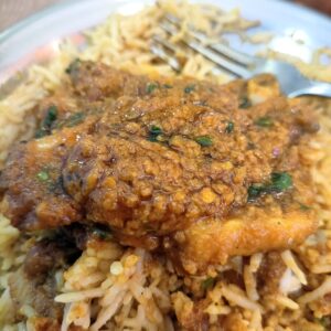 White Fish, later confirmed by Ali as – Tilapia, sat in a Thick Masala. My close up of the Masala would suggest Tomato Seeds, but these were so large they were Daal-like.