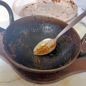 Hot food, an even hotter karahi, take care, Hector. I spooned some Masala on to a valley of Chapatti. The spoon, the only utensil provided.