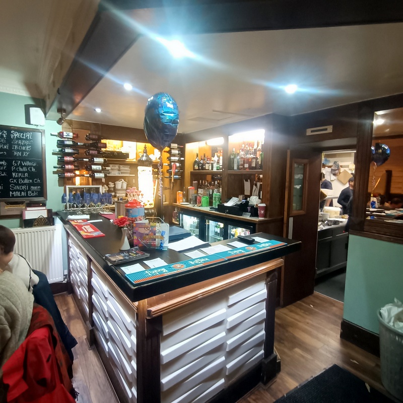 Duly summoned at 21.15, we were allocated a booth table on the right of the still busy restaurant. Alan and Ian, spotted earlier, were in situ, Alan having his oft reviewed Desi Lamb Methi – Spicy, with extra Seasoning, on-the-bone, understood. Ian who admitted to still being a novice here, was tucking in to Truck Stop from today’s Specials Board. Or – something with herbs – as Ian described it.
