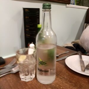 Drinks: Marg and Hector would share a large bottle of Sparkling Water, Eleanor a small bottle of Still, presumably. Fresh Orange for Howard, Yellow, fizzy, Lager for Steve.