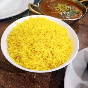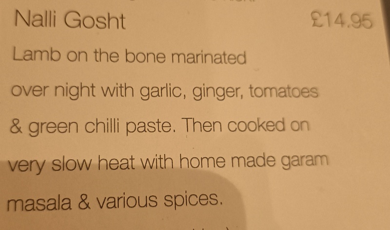 Howard and Eleanor would share a Vegetable Pakora (£5.95), the only ones having a Starter. The rest of us may know better. Eleanor was also the only person to order from the printed menu: Nalli Gosht (£14.95) accompanied by Fried Rice (£3.50). Served – on-the-bone, I wondered why Alan has not highlighted this on previous visits? Howard, having seen Lamb Chops on the Board, was advised that this could become a main course Curry, but opted instead for Beef Lahori (£15.95) with a Garlic & Coriander Naan (£4.95). Steve asked Rocky what Lamb RaRa (£14.95) is. Has he not studied a well known and reliable Curry Blog? Earlier, he also seemed to be surprised when I informed him that the – search box – in the top right corner of every page, has been ever-present in Curry-Heute. Having accepted there would be Keema and Meat in his Curry, RaRa was duly ordered, along with a Plain Nan (£3.25) and Fried Rice. How Steve can manage both Bread and Rice is always commented upon. Also, with that quantity of Sundries, does the Curry not become an accompaniment? The Asian way of eating.