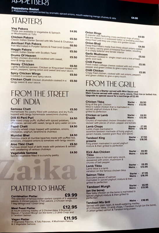 Zaika (61a High Street, Dumbarton, Dunbartonshire, G82 1LS) popped up on a well known online map system, the name rang a bell, but this was a different spelling of Berlin’s finest Desi Curry House – Punjabi Zaiqa. Given that Dumbarton is closer to Hector’s House than Glasgow’s Southside, one always has hopes for this town.