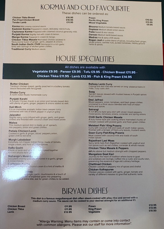 Marg and Hector entered Zaika at 14.10 this Friday afternoon. Two tables were occupied, a group of seven then a couple at a window table with a wean. Fortunately, the latter soon left, with parents. A spacious room, we have been here before, we stood at the entrance for some five minutes, no staff. In time, I chose a table at the far end of the room, away from the group. A waitress emerged from the kitchen, then a turbaned chap, Mein Host. Sadly, there would be no engagement with him for some time.