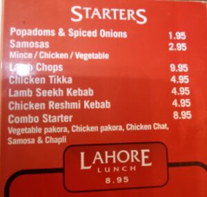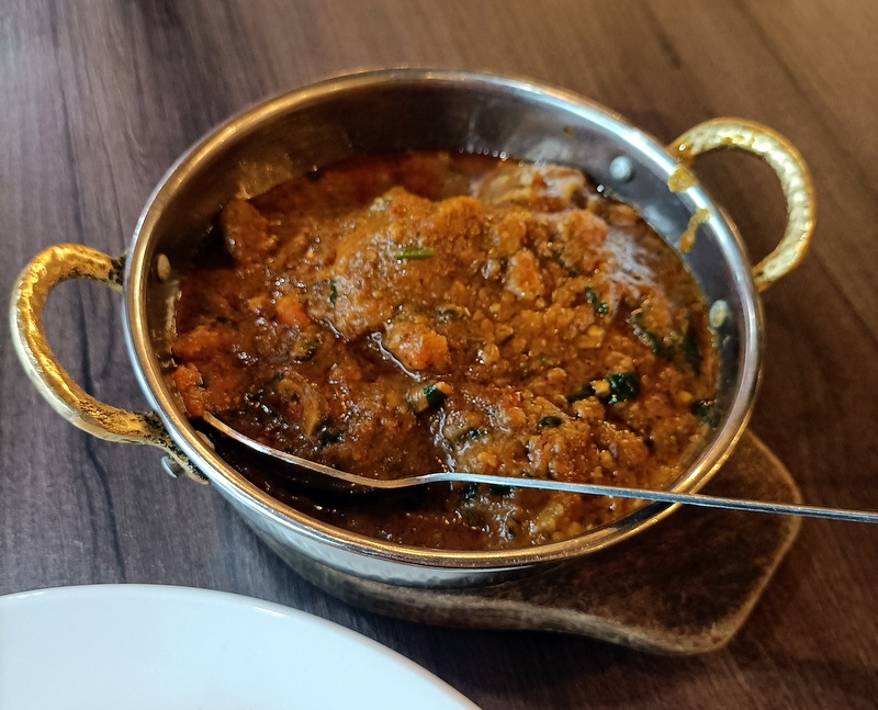 A third Curry in six days was apparently not for Marg, Hector is driven otherwise. At the last minute, the Lahore Lunch (£8.95) became attractive, off we set, arriving at The Village “Curry House” (119 West St., Tradeston, Glasgow G5 8BA) at 14.00. After an al fresco, Sri Lankan Curry at Kotthu Rotti north of the river, and I don’t know what at Zaika (Dumbarton), today it was back to the familiar. The Village continues to offer the most diverse array of Desi Curry on a daily basis.