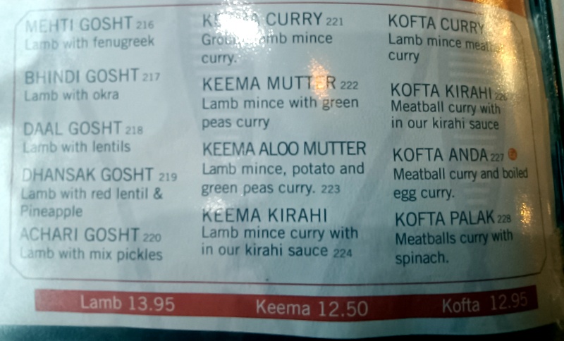 The waitress placed the Lahore Menu on the table, I asked for the main. Achari Gosht (£13.95) was why I was here today, something intense, to resurrect the taste buds after the Chilli onslaught at Zaika.