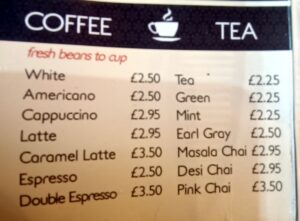 Marg, who earlier was sure she was not coming out for Curry-Heute, spotted Lamb Chops (£9.95) on the Lunch Menu. That was it, well not quite, Coffee after became coffee an afore: Cappuccino (£2.95).