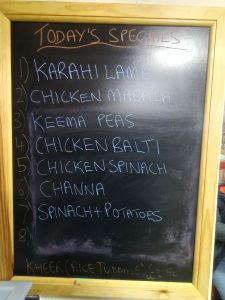 Arriving at 12.45, both Rizwan, Mein Host, and Laala, Chef and his second in command, were in their positions at the counter. Salutations completed, the availability of Fish was confirmed. A quick glance at the board, no Mix Veg. Today, Spinach + Potatoes (£5.50) had replaced it. Oh, why not?