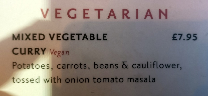 On arranging the Vegetables on top of my plate already filled with Vegetables, Carrot now stood out. Just how much Carrot was there? Green Beans and Peas were uncovered, the latter not listed on the menu. Where was the Potato, the most important of all the Vegetables, surely?