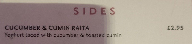 I sat and watched my fellow diners devour their Starters. Maggie overlooked the presence of the tiny tub of Cucumber & Cumin Raita which she had ordered. Dr. Stan had availed himself of this assuming it was included. Simrat, why are you charging £2.95 for this toty offering?