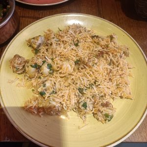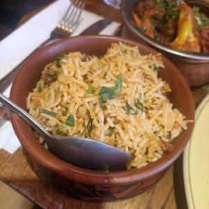 Having enthused at length about the Mushroom Rice (£4.00), which is not on the dine-in menu, three portions would be duly ordered. I assured Simrat that is the only reason why we were here – the best thing on your menu – was delivered, tongue firmly in cheek. Clive would be denied his preferred Keema Naan, a Garlic Naan (£3.75), to share with Maggie, was in order.