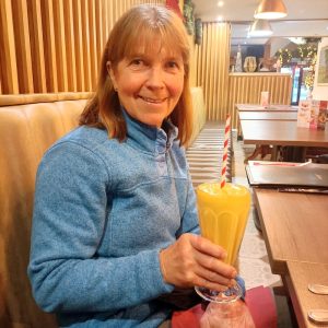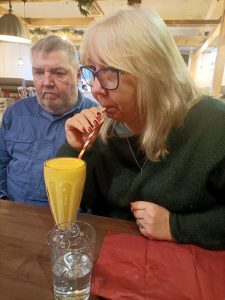 From the Lahori Lunch Menu, Marg chose Vegetable Pakora, then Lamb Curry with the two Chapatti option. She only ever eats one. A glass of Mango Lassi (£3.50) was her indulgence for the day.