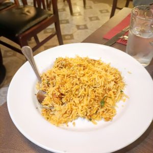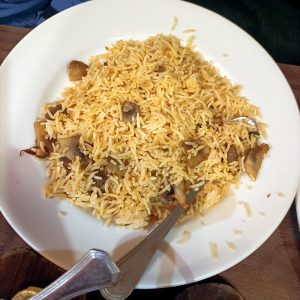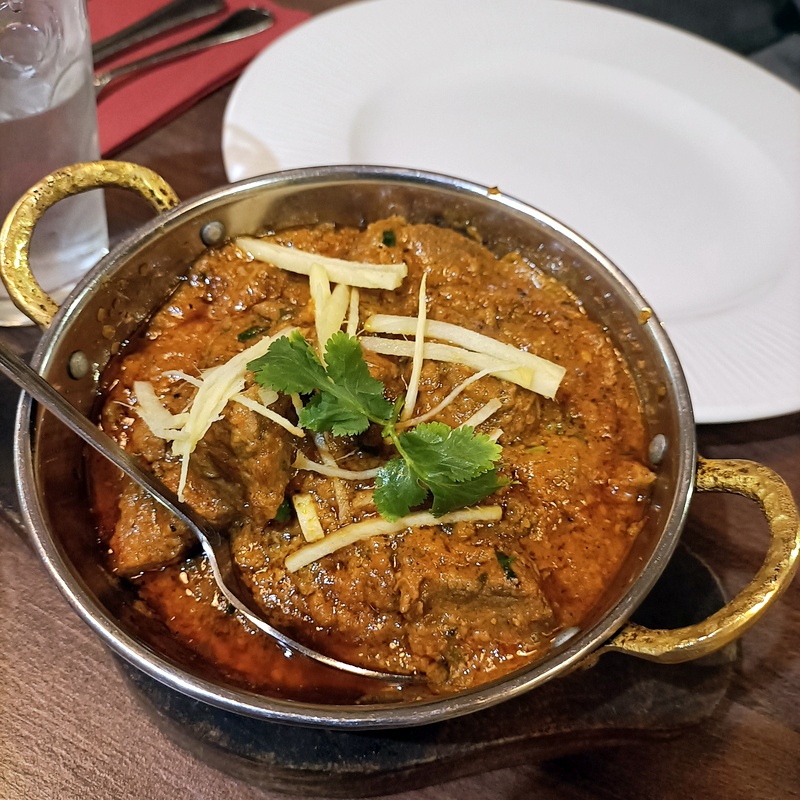 Maggie: Large portion, the first thing I noticed was the ghee. Too much for me, needed a good stir as all the spice was in the ghee. Large pieces of lamb no gristle. Mushroom rice large portion enough to share. Not as good as Curry Pot.