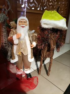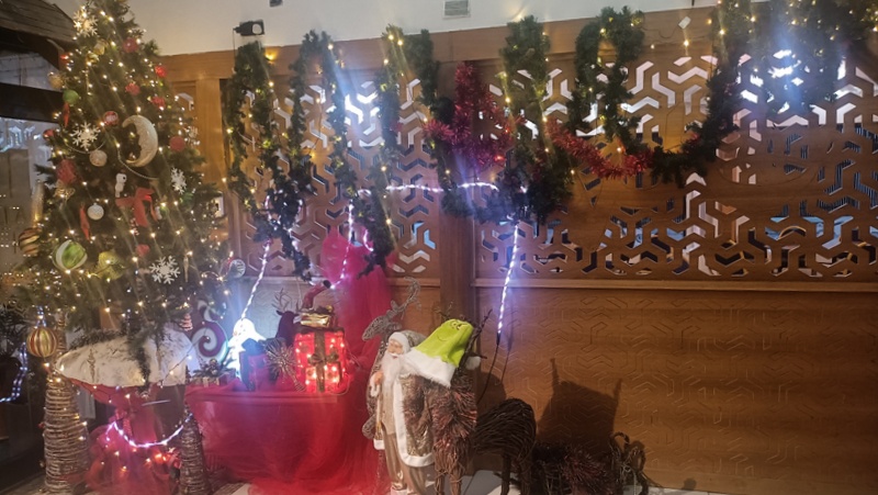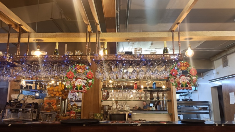At first, the waitress offered us one of the booth style tables mid-room. Clearly, five of us would not fit on this. Instead, I pointed to the area of seating under the balcony. Never having sat here previously, this was a new perspective. Seasonal decorations confirmed that the nadir of sunlight looms. Marg loves this time of year, the Hector, well, one plays along.