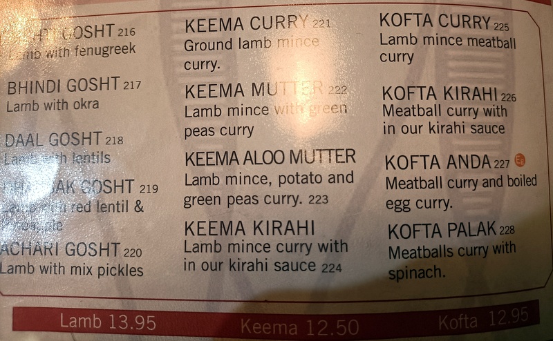 Maggie quickly spotted the kilo, Tawa Kirahi (£49.95), that’s even dearer than London prices, ouch, and no thanks. Yesterday at Staggs (Musselburgh) whilst celebrating Clive’s Big birthday, Jim declared that we are overdue going out for the kilo of Karahi Gosht, we won’t be having it here.