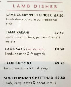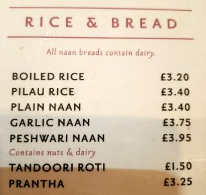 After much consideration of the Bread options, Marg went for her usual Chapatti, or Tandoori Roti (£1.50), as the serving chap made very clear. Does this mean they do – proper – Chapattis also?