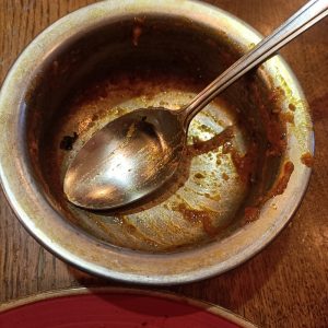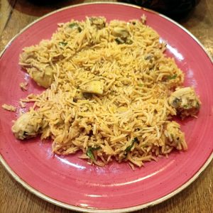 Adding the retained Masala, a further delight. The Meat to Masala ratio was spot on, no Rice left uncovered, plenty of solids towards the end. The choice, finish on a Mushroom or a piece of Meat. Hector was in a happy place, however, one criticism – everything could have been served hotter.