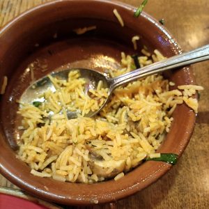 Mushroom Rice (£4.00) for Hector, one day I’ll have something else, Biryani perhaps, which is advertised on the wall, and tucked away in the Takeaway menu. Tap water would suffice as the liquid accompaniment.