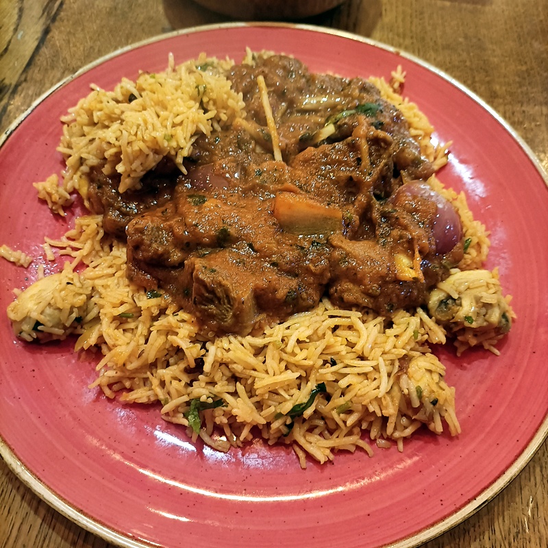 Adding the retained Masala, a further delight. The Meat to Masala ratio was spot on, no Rice left uncovered, plenty of solids towards the end. The choice, finish on a Mushroom or a piece of Meat. Hector was in a happy place, however, one criticism – everything could have been served hotter.