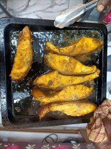 Rohu – he informed me, from the rivers of his native Bangladesh. Carp – is how we identify this outrageously healthy Fish. It would need twenty minutes to cook. The Rohu, had been cut to create Fish Steaks as Mother used to present Cod in Hector’s formative years. I was warned that there would be bones. In time, he gave a lesson on all the fresh water fish available to him, and the hefty prices charged for some.