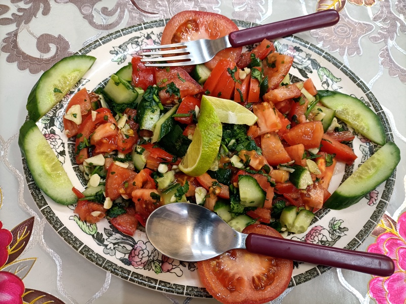 With somewhat garish plastic table coverings and bare walls, the décor might be described as either rustic, or unfinished. Having returned to the front of house, Ahmed got busy chopping some Coriander. At some point he raised the matter of Spice Level. Above medium – was agreed. That I was willing to have food at this level evidently pleased him, no need to hold back. Flipping between the front and the rear of the premises, Ahmed methodically progressed towards serving my Curry. A half hour had passed when he brought over a plate of Salad, to keep me going.