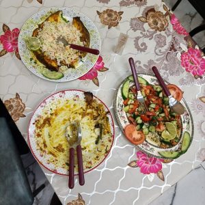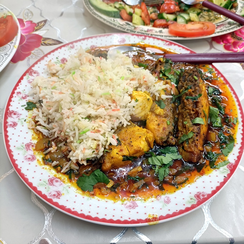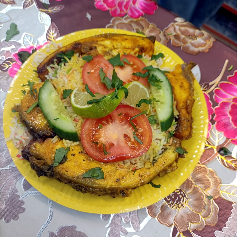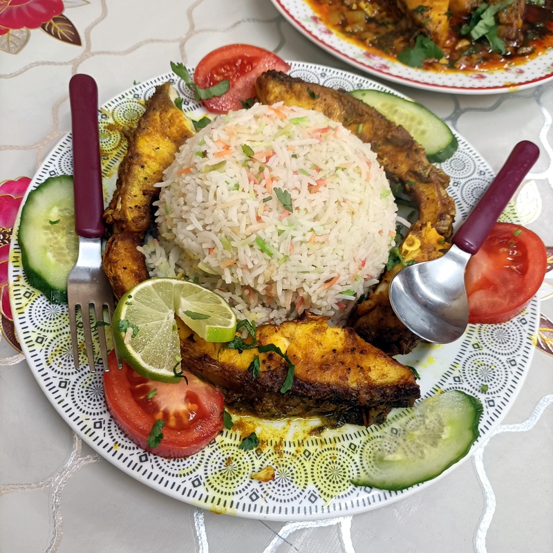 I watched the artistry as a plate with three substantial pieces of Rohu was adorned with further Tomato and Cucumber, before a family sized portion of Basmati was placed centrally.