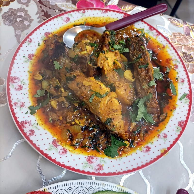 Three substantial Rohu Steaks, with Spice clearly absorbed, sat in what looked like an Oily Shorva in parts, not quite a Masala in others. Finely chopped Onions and Green Chillies, cut lengthways, were in there too. The Toppings, more fresh Coriander and even more sliced Garlic. The Hector was not going to be popular this evening.