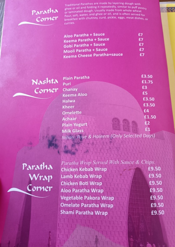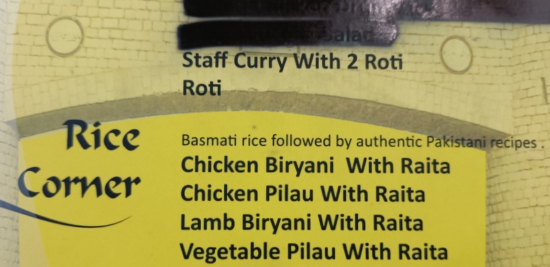 Assuming the two chaps were the same ones I spoke to on Saturday, I reiterated my observation that they do not advertise that Curry is sold on these premises. The same list was recited: Lamb Curry, Chicken Curry, Paya, Nihari. Only later did I notice that – Staff Curry With 2 Roti (£10.00) is on the in-house menu (below).