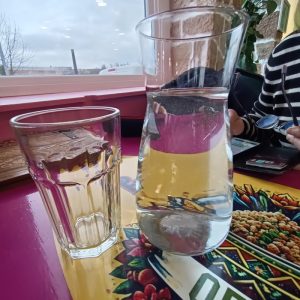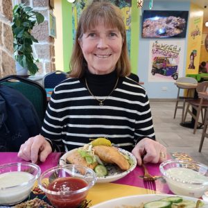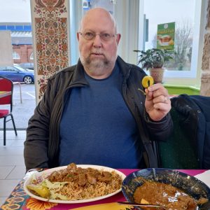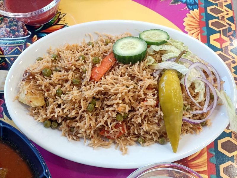 Cucumber slices, plural, Onion and a threat of Lettuce decorated the impressive looking Pilau. I now had two Pickled Chillies! The rest crossed the table to complement Marg’s allotted Salad quota.