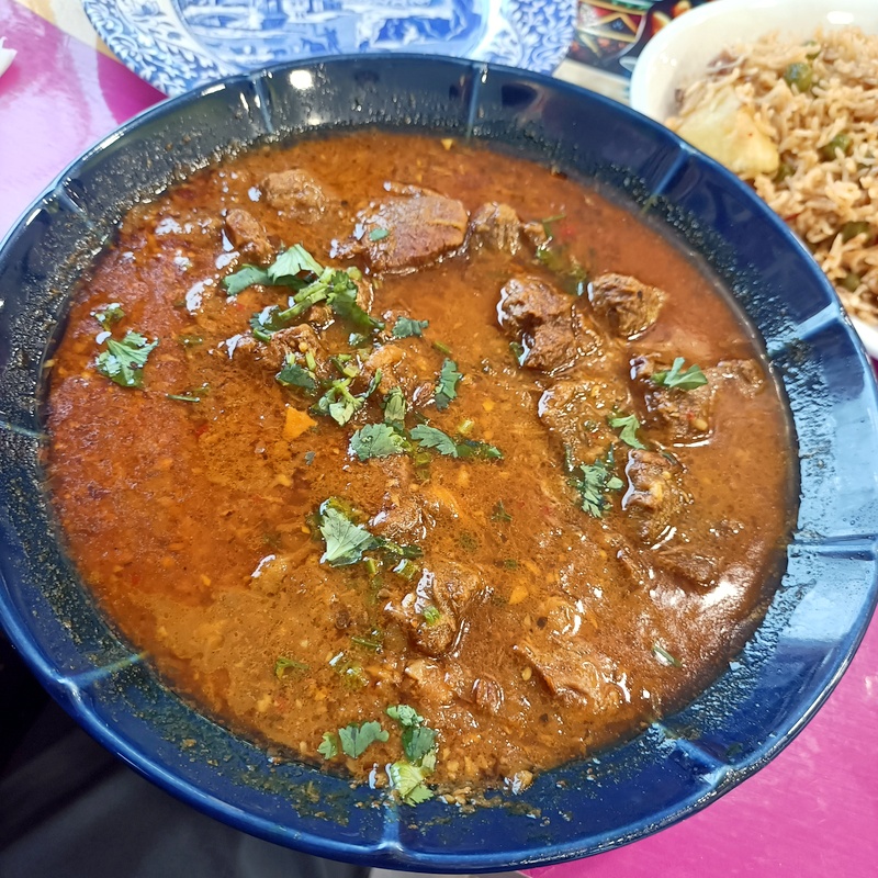 A large soup plate, full of a Shorva-esque Masala. Initially I wondered if this was the dreaded Soupy Curry, however, the photo shows twelve pieces of Meat protruding. Double figures was a given as I arranged the Meat on the Pilau. I counted to twenty, I still had no idea what the price of this Dish would be, £10.00 was the only clue given on the menu. If so, this was exceptionally good value. Lamb on-the-bone, as was revealed by the presence of a singular Sucky Bone. The Hector was in a good place.