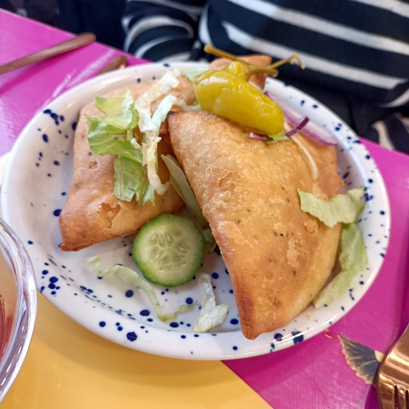 Marg was attracted to the Chatt Corner section of the menu. Lamb Samosa Chatt (£7.00) was mooted, but then the waiter and Hector simultaneously advised Marg that this would feature a smothering a Yoghurt. That makes everything soggy, Chickpeas usually feature, a better option was selected: Samos (2 Samosa + Sauce & Salad) (£5.00), much more to her liking. Kashmiri Chai (£3.50) was not to be missed.