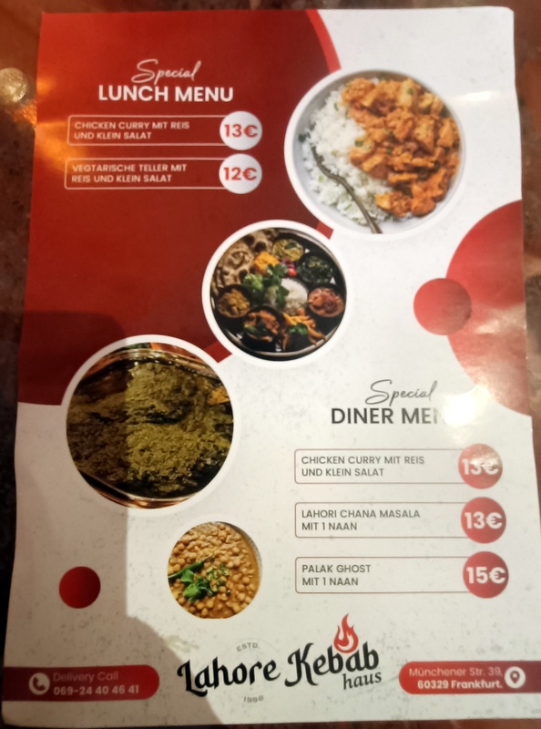 Lahore Kebab Haus (Münchener Strasee 39, 60329 Frankfurt am Main, Deutschland) was recommended by the chaps at Desi Dhaba (Aachen) two days ago. Lahore Kebab Haus happens to be the only Frankfurt Curry House already reviewed in Curry-Heute, some thirteen years ago, Perhaps Hector has an instinct for these things. However, the Curry that day was hardly impressive.